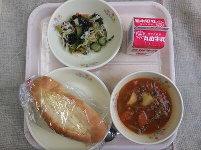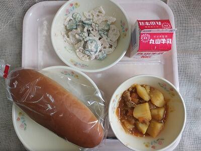【今日の献立】黒糖パン・肉と野菜のカレー煮込み・れんこんサラダ・牛乳