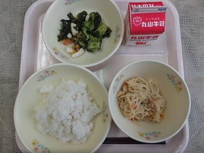 りっちゃんサラダは、小学6年生で4番目、中学3年生で5番目に人気があった献立です。1年生の国語の教科書に「サラダでげんき」というお話があります。その中に出てくる女の子「りっちゃん」は、お母さんの病気を治そうとサラダを作ることを思いつきます。たくさんの動物がアドバイス、ねこはかつおぶしを、犬はハムを、すずめはとうもろこしを、ありは砂糖を、馬はにんじんを、白くまは昆布をアフリカ象は油と塩をかけて力強くかき混ぜます。今日の給食「りっちゃんサラダ」は、このお話に出てくる材料を入れました。食べるのが遅かった1年生も、もうすぐ2年生、減らしたり残したりせずしっかり食べることができるようになりましたね。