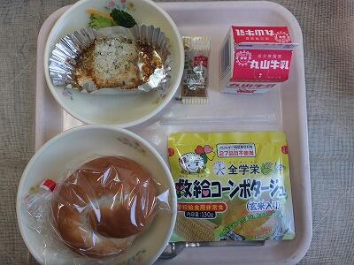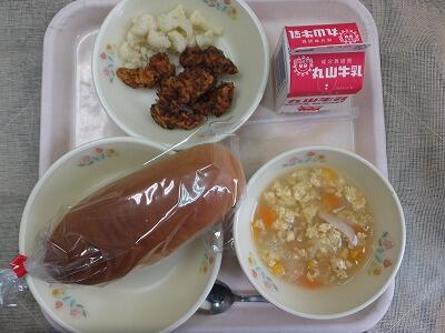 【今日の献立】黒糖パン・たこ焼き風・カリフラワーのドレッシング和え・コーンスープ・牛乳