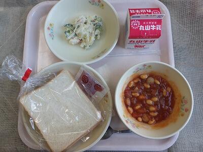 【今日の献立】食パン・いちごジャム・チリコンカン・ポテトサラダ・牛乳