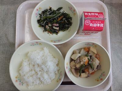 【今日の献立】麦ご飯・根菜の煮物・小松菜の磯和え・牛乳