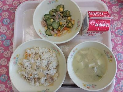 【献立】竹の子ご飯・じゃがいもの味噌汁・新玉サラダ・牛乳