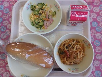 【献立】減量パン・春野菜のスパゲティ・卵サラダ・牛乳