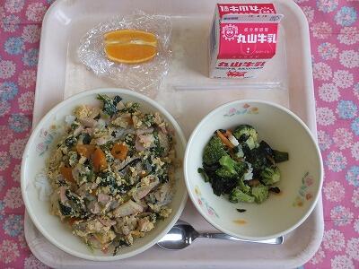 【献立一口メモ】中学1年生は今日から給食が始まります。中学校は、給食時間が短いので、最初から黙々と食べましょう。給食当番の配膳も重要です。食缶に残さず、同じ量につぎ分けることで、一人分がどれだけか分かります。親子丼やカレーライス等、ご飯の上に具をかける料理は、考えて配膳しないと足りなくなり、調整に時間がかかります。日頃から家族のご飯をつぎ分ける等、手伝いをたくさんして、調整する力を身につけてください。