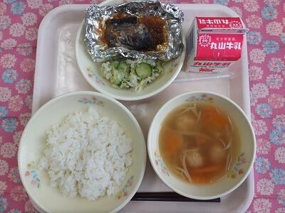【献立一口メモ】日本が世界の中でも長寿の国であるのは、バランスのとれた食生活のおかげだといわれています。私たちの食事は、主食のご飯を中心に、旬の食材を使った主菜(魚肉のおかず)、副菜(野菜のおかず)、汁物をバランスよく組み合わせた「日本型食生活」だからです。しかし、今、その食生活は洋風化し、油の多い食事へと代わってきています。今日の給食は「日本型食生活」の基本的なものです。主食が麦ご飯、主菜が鯖ホイル焼き、副菜が三色和え、汁物が団子汁となっています。家でも主食・主菜・副菜を組合わせて食べましょう。