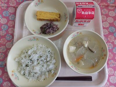 【献立】いりこ菜飯・卵焼き・ゆかり和え・豚汁・牛乳