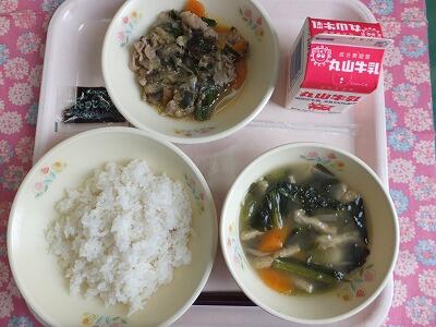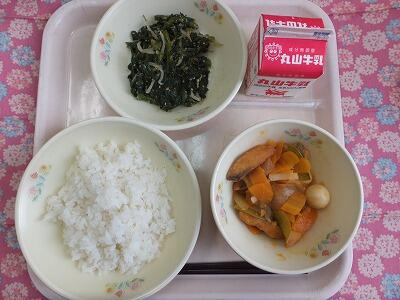 【献立一口メモ】昔の日本人はお米をたくさん食べていました。宮沢賢治の「雨ニモマケズ」では1日に玄米4合と…という言葉がありますので、1日お茶碗8杯分くらいは食べていたことになります。ご飯には食物繊維も多く含まれていますので、しっかり食べましょう。給食のご飯が多いと思う人は普段のご飯の量が少なすぎるのかもしれません。給食は、主食3、主菜1、副菜2の割合になるように献立を立てています。副菜である野菜が多いと感じるかも知れませんが、病気に負けない体を作るために必要です。