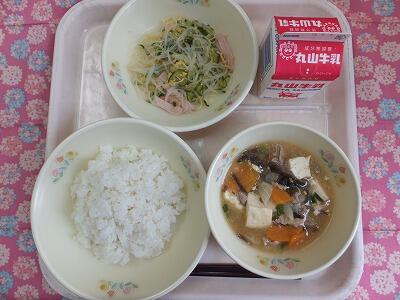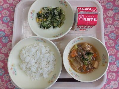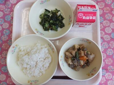 【献立一口メモ】学校給食には栄養基準量があり、毎日の給食はそれを満たすように献立を立てています。クラスで均等につぎ分けた量が、皆さんに必要な量です。たんぱく質が足りないと、成長に影響しますし、ビタミンが足りないと体の調子が整いません。給食の献立には、一つ一つに意味があるのです。残さず食べるようにしましょう。