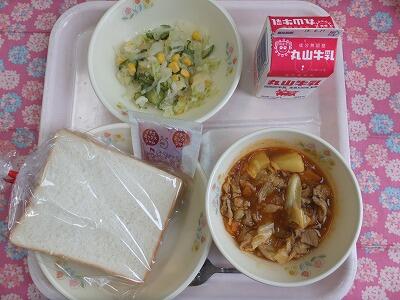 【献立】食パン・いちごジャム・肉と野菜のカレー煮込み・スタミナサラダ・牛乳