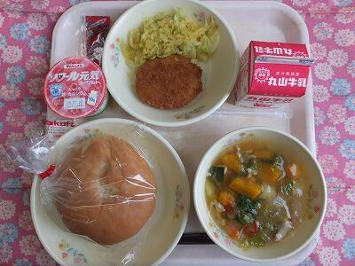 【献立】セルフバーガー(コロッケ)・野菜のカラフルスープ・ヨーグルト・牛乳