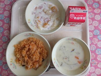 【献立】ジャンバラヤ・味噌入りスープ・フルーツヨーグルト・牛乳