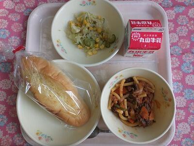 【献立】マヨネーズパン・牛肉とマカロニのトマト煮・スタミナサラダ・牛乳
