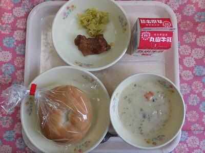 【献立一口メモ】クラムチャウダーとは、あさりなど2枚貝の入ったスープのことです。今日の給食には、あさり、貝柱、ベーコン、玉ねぎ、にんじん、じゃがいも、ブロッコリー、パセリ、牛乳等、多くの種類の食材が入っています。ファストフードで、ハンバーガーを注文する時は、フライドポテトやシェイクではなく、具材の多いスープやサラダを組み合わせるようにしましょう。