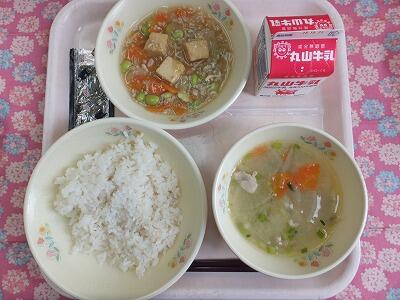 【献立】もち麦ご飯・麻婆豆腐カレー風味・パンサンスー・牛乳
