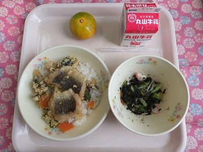 【献立】鱧天丼・小松菜の磯和え・果物・牛乳
