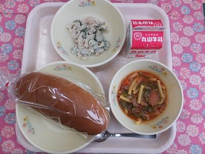【献立】ミルクパン・牛肉とマカロニのトマト煮・れんこんサラダ・牛乳