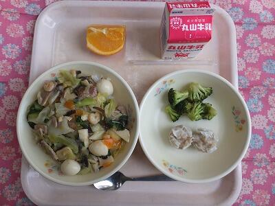 【献立】中華どんぶり・シュウマイ・ブロッコリー・果物・牛乳