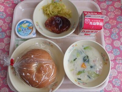 【献立】ハンバーガー・野菜のクリームスープ・果物・牛乳