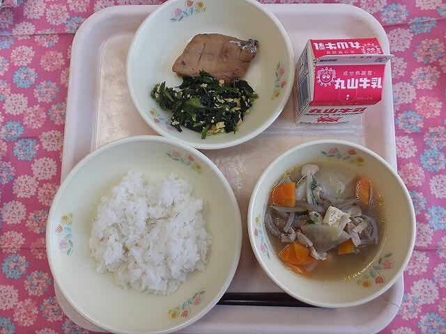 【献立】麦ごはん・さわら西京焼き・菜の花の辛し和え・けんちん汁・牛乳