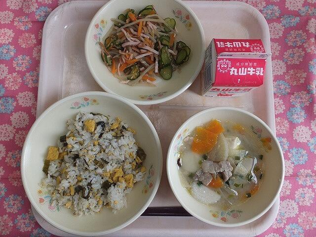 【献立】高菜ごはん・豚汁・かみかみ和え・牛乳
