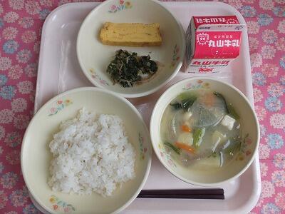 【献立】麦ごはん・卵焼き・おかか和え・豆豚汁・牛乳