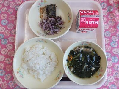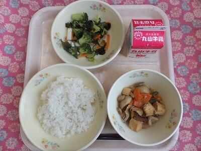 【献立一口メモ】昔の日本人はお米をたくさん食べていました。宮沢賢治の「雨ニモマケズ」では1日に玄米4合と…という言葉がありますので、1日お茶碗8杯分くらいは食べていたことになります。ご飯には食物繊維も多く含まれていますので、しっかり食べましょう。給食のご飯が多いと思う人は普段のご飯の量が少なすぎるのかもしれません。給食は、主食3、主菜1、副菜2の割合になるように献立を立てています。副菜である野菜が多いと感じるかも知れませんが、病気に負けない体を作るために必要です。