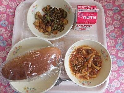 【献立】黒糖パン・牛肉とマカロニのトマト煮・ゴーヤかりんとう揚げ・牛乳