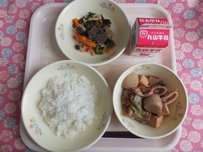 【献立】麦ごはん・いかと大根の煮付け・牛肉のへべ酢和え・牛乳