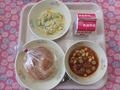 【献立】米粉パン・チリコンカン・かぼちゃのサラダ・牛乳