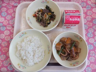 【献立名】麦ごはん・いかと大根の煮つけ・牛肉のへべす和え・牛乳