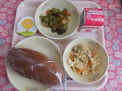 【献立名】黒糖パン・炒り豆腐・カレーマリネ・デザート・牛乳