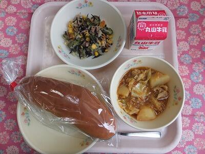 【献立】ミルクパン・肉と野菜のカレー煮込み・ひじきのサラダ・牛乳