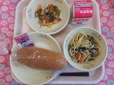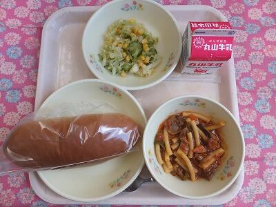 【献立】ミルクパン・牛肉とマカロニのトマト煮・スタミナサラダ・牛乳