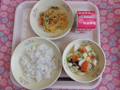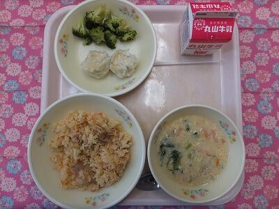 【献立】キムチチャーハン・豆腐シューマイ・ブロッコリー・かにとチンゲン菜のスープ・牛乳
