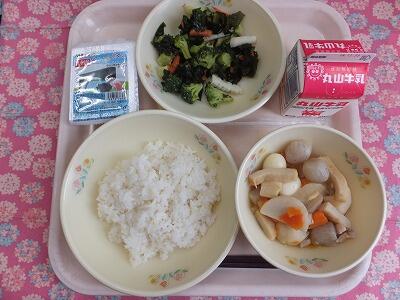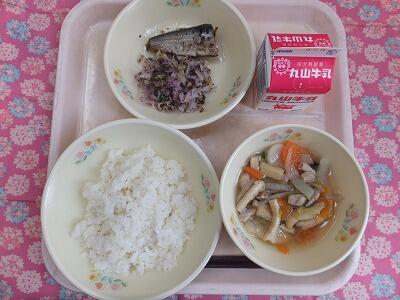 【献立】麦ごはん・いわし生姜煮・ゆかり和え・団子汁・牛乳