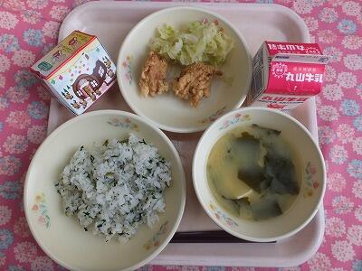 【献立】菜めし・唐揚げ・ボイルキャベツ・味噌汁・クリスマスケーキ・牛乳