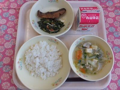 【献立】もち麦ごはん・鮭の塩焼き・ほうれん草と沢庵の胡麻和え・団子汁・牛乳