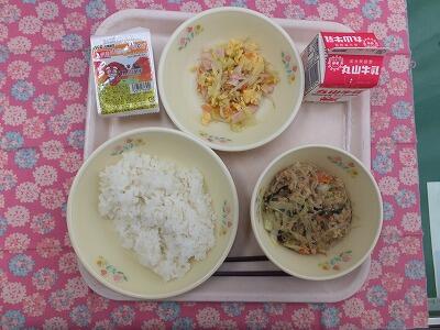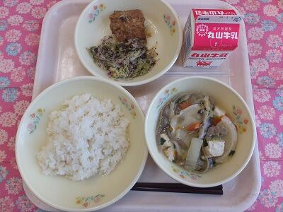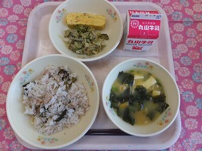 【献立】野沢菜ご飯・卵焼き・昆布和え・味噌汁・牛乳