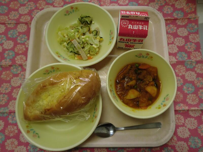 【献立】 マヨネーズパン・かぼちゃのミートソース煮・チーズサラダ・牛乳