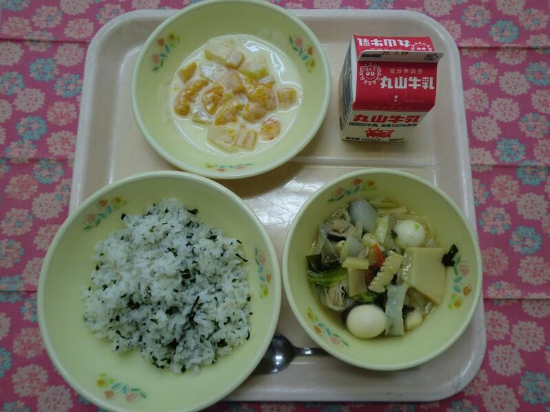 【献立】 わかめごはん・八宝菜・フルーツのオレンジソースかけ・牛乳