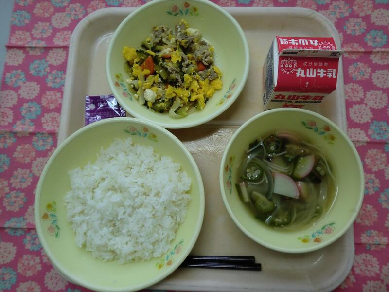 【献立】 むぎごはん・ゴーヤチャンプルー・そうめん汁・ゆかりふりかけ・牛乳