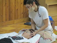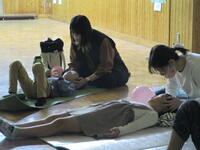 風船を使った練習が終わると、少し照明を落として、お子さんとの呼吸のリズムに保護者の呼吸のリズムを合わせ、ゆっくりと両手で頭全体をおしたり緩めたりしました。そして、親子のスキンシップも確かめていました。気持ちがよくなったお子さんの中には、夢の世界に入っていったお子さんもいました。