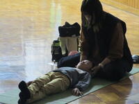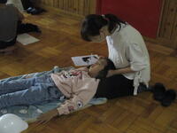 講師の方が、常にそれぞれの親子のところを回ってくださり、熱心にお手本を示してくださったり、「このくらいのリズムや強さでおすといいですよ。」と保護者の腕や太もも、頭に手を当てて、実感してもらったりしました。