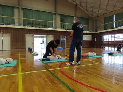 AEDの使い方も学習し、胸骨圧迫(心肺蘇生)とAEDの組み合わせによる一次救命処置練習を行いました。