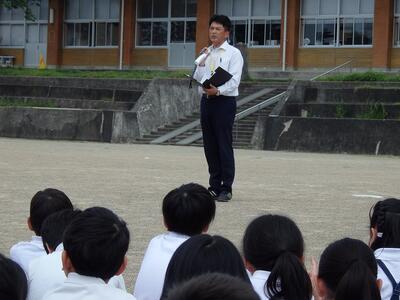 運動場では、校長先生及び不審者役の警察官から話がありました。