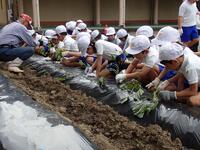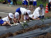 苗を1本ずついただくと、一斉に植え始めました。中には、植え方に悩んでいる児童がいましたので、すぐに地域の方々や門川町地域おこし協力隊の方が駆け寄り、やさしい言葉をかけて手伝ってくださいました。