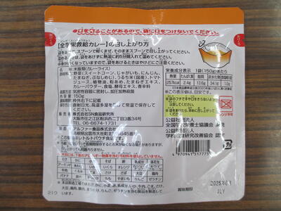 簡単だと思います。牛乳、サラダ、スープはよく食べますが、左下にパンでもない、米飯でもないものが置かれています。これは、災害に備えた非常食の中の「救給カレー」です。この「救給カレー」は、東日本大震災を経験された栄養士の先生たちが話し合って作ったものだそうです。被災してとても怖くて、不便な経験をしたことから、水も電気も火も使えない事態の中での非常食として開発されました。「いのちをつなぐ」カレーとして、(食)を救う「救給カレー」と名付けられました。