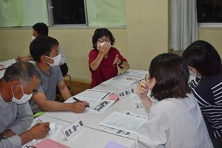 その後、①について全体で話し合い、「参加者を増やすための方策」や「避難場所や参加協力企業等への依頼方法」等について意見を出し合いました。