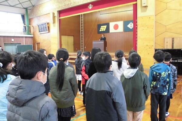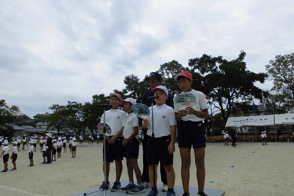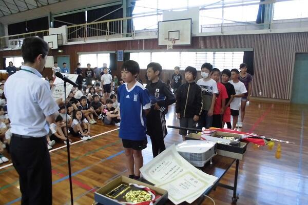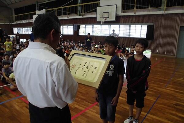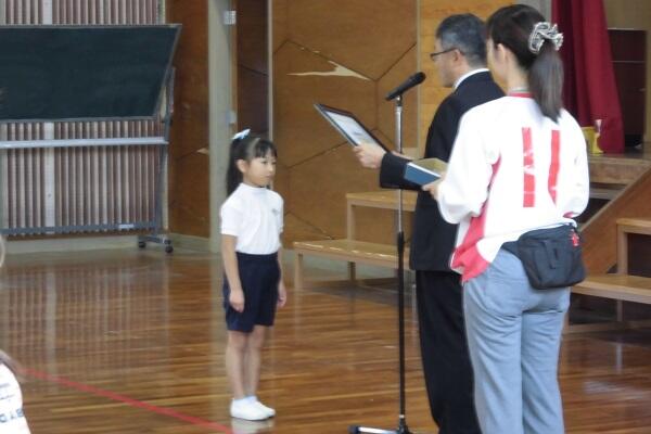 また,スポーツに関する表彰も行いました。サッカー,バレー,ソフトがそれぞれ大会で優勝,6年の安藤菜々美さんが2kmマラソンで3位ということで表彰をしました。