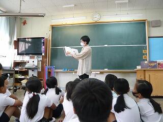 最近は、朝夕がすっかり涼しくなり、夏の空気から秋の空気へと変わってきました。10月は「読書月間」として位置づけ、読書に関するいろいろな取組を学校全体で行っています。10月13日(火)には、朝の時間を使って「読み聞かせランド」を開きました。学校内のすべての先生方が、各学級に分かれて、お気に入りの本を子どもたちに読み聞かせしました。床に座って聞く学級もあれば、椅子を持ち寄って円形になる学級、クイズ形式で読み聞かせする学級、先生方も、子どもたちのことを考え、様々に工夫していました。